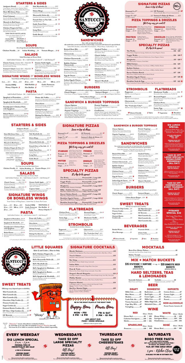 You asked, and we listened—we didn’t want University City to wait any longer! During our soft opening period, our complete menu is available for takeout, pickup, and first- and third-party delivery. Order in person, by phone, online, or through our brand-new mobile app to enjoy our legendary square pizza, pasta dishes, wings, cheesesteaks, Italian sandwiches, and more. Sign up for Pizza Perks Rewards today to start earning points toward free pizza with every order! During this phase, we’re fine-tuning our kitchen operations, perfecting our training, and ensuring every detail of our customer service meets the Santucci’s standard of excellence.