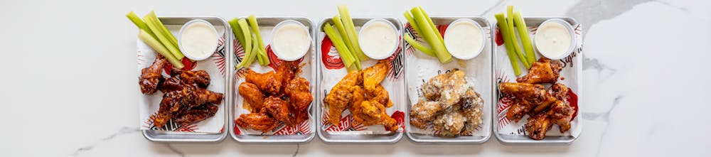 Packaged in aluminum tray for easy reheating.Choose from: Mild Buffalo, Hot Buffalo, Honey Chipotle, Smoked BBQ, Garlic Parm